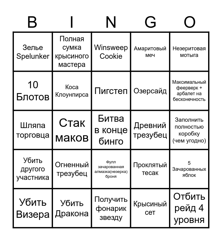 This bingo card has a free space and 24 words: Убить Визера, Огненный трезубец, Пигстеп, Крысиный сет, Незеритовая мотыга, Зелье Spelunker, Полная сумка крысиного мастера, Winsweep Cookie, Древний трезубец, Заполнить полностью коробку (чем угодно), Шляпа торговца, Коса Клоунпирса, Проклятый тесак, 5 Зачарованных яблок, 10 Блотов, Убить Дракона, Получить фонарик звезду, Амаритовый меч, Максимальный феерверк + арбалет на бесконечность, Убить другого участника, Стак маков, Фулл зачарованная алмазка(незерка) броня, Озерсайд and Отбить рейд 4 уровня.