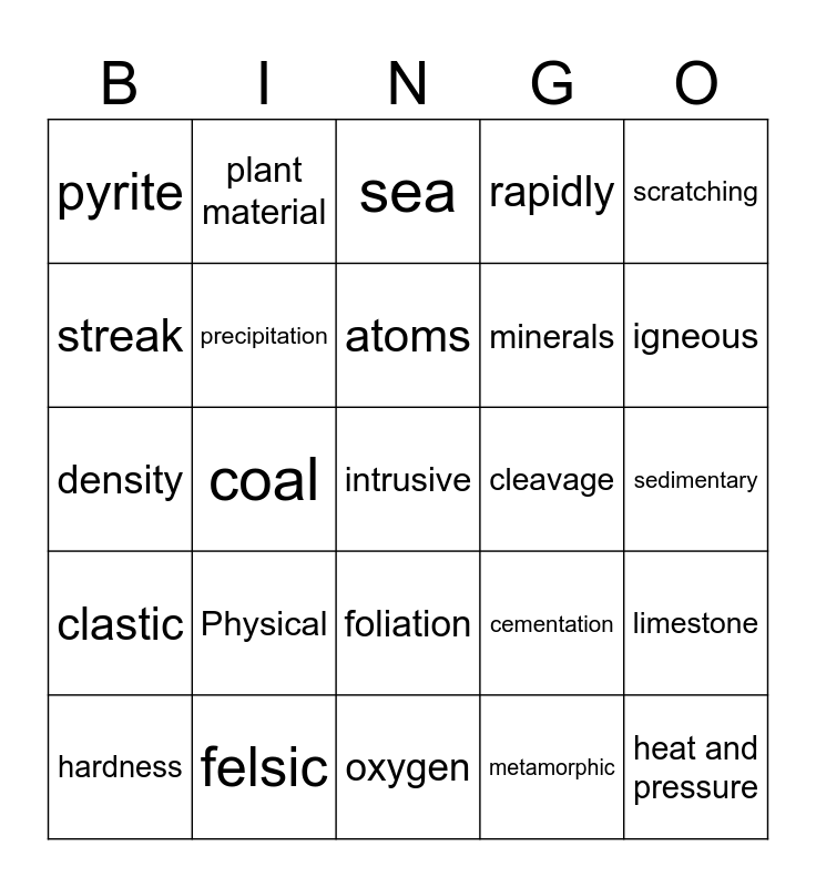 This bingo card has 25 words: Physical, oxygen, atoms, hardness, scratching, pyrite, streak, plant material, cleavage, foliation, minerals, density, cementation, limestone, precipitation, heat and pressure, sedimentary, sea, igneous, coal, intrusive, felsic, clastic, rapidly and metamorphic.