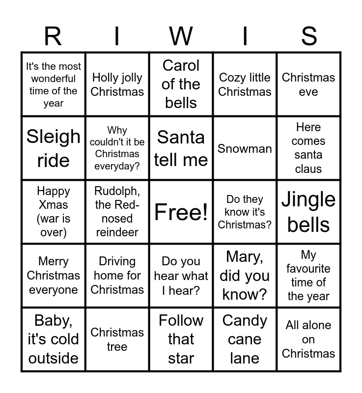 This bingo card has a free space and 45 words: 8 days of Christmas, All alone on Christmas, All I want for Christmasis you, Baby, it's cold outside, Being alone at Christmas, Candy cane lane, Carol of the bells, Christmas (baby please come home), Christmas eve, Christmas tree, Cozy little Christmas, Do they know it's Christmas?, Do you hear what I hear?, Driving home for Christmas, Feliz navidad, Follow that star, Frosty the snowman, Happy Xmas (war is over), Have yourself a merry little Christmas, Here comes santa claus, Holly jolly Christmas, I saw mommy kissing santa claus, it's beginning to look a lot like Christmas, It's the most wonderful time of the year, Jingle bell rock, Jingle bells, Last Christmas, Let it snow! Let it snow! Let it snow!, Mary, did you know?, Merry Christmas everyone, Mistletoe, My favourite time of the year, Oh, it's Christmas, O holy night, Rockin' around the Christmas tree, Rudolph, the Red-nosed reindeer, Santa, can't you hear me, Santa claus is comin' to town, Santa's coming for us, Santa tell me, Sleigh ride, Snowman, Underneath the tree, Why couldn't it be Christmas everyday? and Winter wonderland.