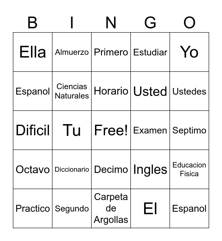This bingo card has a free space and 52 words: Ingles, Espanol, Calculadora, Carpeta de Argollas, Diccionario, Necesito, Almuerzo, La Clase, Espanol, Arte, Ciencias Naturales, Ciencias Sociales, Educacion Fisica, Ingles, Tecnologia, Matematicas, Horario, Examen, Tarea, Yo, Tu, El, Ella, Usted, Nosotros, Vosotros, Ellos, Ellas, Ustedes, Contestar, Ensenar, Estudiar, Hablar, Tomar Apuntes, Sacar una Buena Nota, Primero, Segundo, Tercero, Cuarto, Quinto, Sexto, Septimo, Octavo, Noveno, Decimo, Aburrido, Divertido, Dificil, Facil, Interesante, Practico and Interesante.