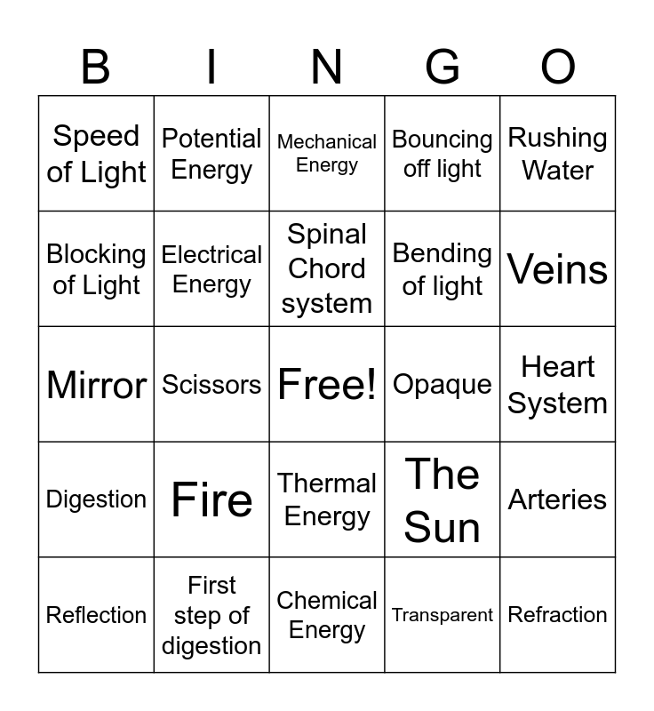 This bingo card has a free space and 31 words: Chemical Energy, Omnivore, Scissors, Brain System, Speed of Light, Mechanical Energy, Electrical Energy, The Sun, Opaque, Transparent, Heart System, Refraction, Nuclear Energy, Absorption, Veins, Kinetic Energy, Arteries, Fire, Digestion, Thermal Energy, Rushing Water, Decomposer, Reflection, Potential Energy, Bending of light, Blocking of Light, Bouncing off light, Mirror, First step of digestion, Spinal Chord system and Carrying Capacity.