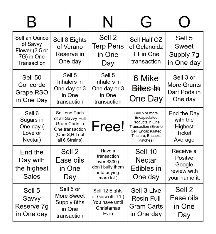 This bingo card has 1 images, a free space and 24 words: Sell 5 Savvy Reserve 7g in One day, Sell 2 Ease oils in One Day, Sell 5 Inhalers in One day or 3 in One transaction, Sell 3 Live Resin Full Gram Carts in One day, Sell 5 Sweet Supply 7g in One day, Sell an Ounce of Savvy Flower (3.5 or 7G) in One Transaction, Sell 8 Eights of Verano Reserve in One day, Sell 2 Terp Pens in One Day, Sell 5 or more Encapsulated Products in One Transaction (Evovle Gel, Encapsulated Tincture, Encaps, Patches), End the Day with the Highest Ticket Average, Sell 6 Sugars in One day ( Love or Nectar), Sell 5 Inhalers in One day or 3 in One transaction, Sell 10 Nectar Edibles in One day, Receive a Positve Google review with your name it., Sell 50 Concorde Grape RSO in One Day, Sell 5 or More Sweet Supply 8ths in One transaction, Sell 12 Eights of Gascotti T1 ( You have until Christamas Eve), Sell Half OZ of Gelanoidz T1 in One transaction, Sell 3 or More Grunts Dart Pods in One day, End the Day with the highest Sales, Sell one Each of all Savvy Full Gram Carts in One transaction (One S,H,I not all 6 Strains), Have a transaction over $300 ( don’t bully them into buying more lol ), 6 Mike Bites In One Day and Sell 2 Ease oils in One Day.