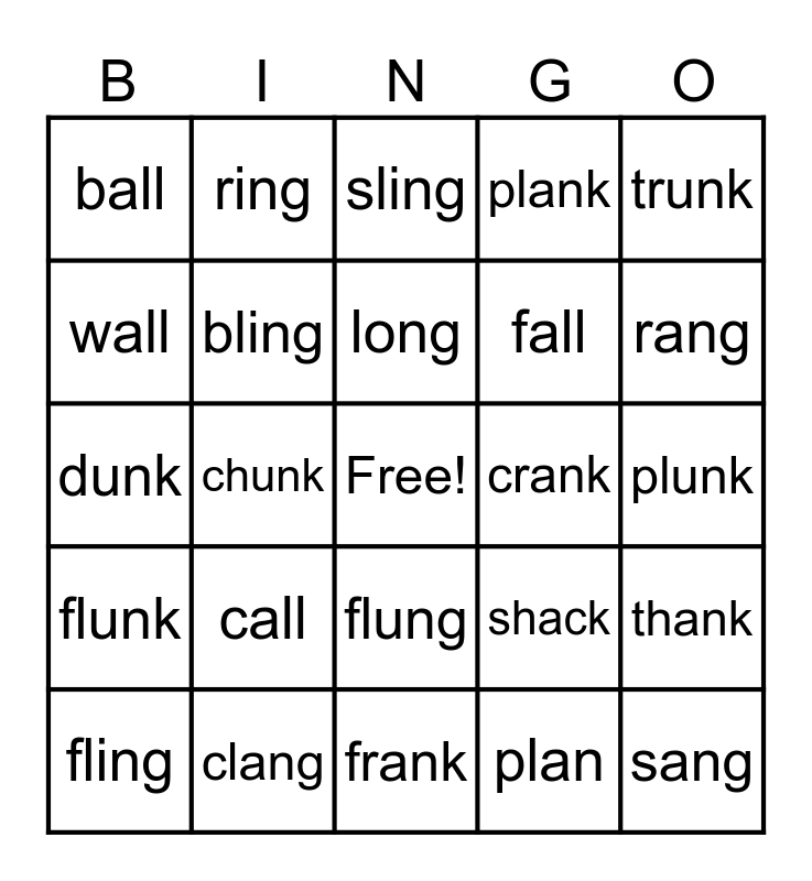 This bingo card has a free space and 32 words: plan, cram, chunk, fang, flunk, bling, trunk, thank, ring, song, long, sling, child, think, crank, blank, fling, dunk, flung, call, shack, thunk, plunk, clang, sang, plank, fall, wall, ball, frank, ranch and rang.