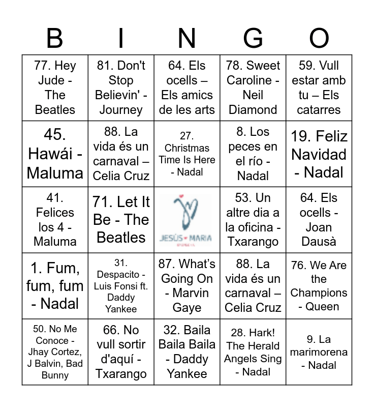 This bingo card has a free space and 340 words: 1. Fum, fum, fum - Nadal, 2. Caga tió - Nadal, 3. El noi de la mare - Nadal, 4. Muntanyes del Canigó - Nadal, 5. Els pessebres - Nadal, 6. Hacia Belén va una burra - Nadal, 7. Noche de paz - Nadal, 8. Los peces en el río - Nadal, 9. La marimorena - Nadal, 10. Campana sobre campana - Nadal, 11. Adeste Fideles - Nadal, 12. Vente a mi casa en Navidad - Nadal, 13. Ding Dong Merrily on High - Nadal, 14. Blanca Navidad - Nadal, 15. Santa Claus llegó a la ciudad – Nadalfins aki, 16. We Wish You a Merry Christmas - Nadal, 17. Rodolfo el reno - Nadal, 18. Jingle Bells - Nadal, 19. Feliz Navidad - Nadal, 20. All I Want for Christmas Is You - Nadal, 21. Navidad, Navidad - Nadal, 22. Petit arbre - Nadal, 23. El tió de Nadal - Nadal, 24. Bels navidads - Nadal, 42. Mia - Bad Bunny ft. Drake, 43. Bichota - Karol G, 44. Criminal - Natti Natasha & Ozuna, 45. Hawái - Maluma, 46. Otro Trago - Sech ft. Darell, 47. Diosa - Yandel, 48. La Canción - J Balvin & Bad Bunny, 49. Tú Me Quieres Volver - C. Tangana, 50. No Me Conoce - Jhay Cortez, J Balvin, Bad Bunny, 51. Boig per tu - Sau, 52. Llença’t - Els Amics de les Arts, 53. Un altre dia a la oficina - Txarango, 54. El meu millor dia - Blaumut, 55. No em vas entendre - Manel, 56. Per tu - Els Pets, 57. Que tinguem sort - Lluís Llach, 58. Els meus amics - La Pegatina, 59. Vull ser a casa - La iaia, 60. Tot l'herba de l'any - Lax'n'Busto, 61. Compta amb mi - Manel, 62. El vent - Sopa de Cabra, 63. Els camins que vas recórrer - Miquel del Roig, 64. Els ocells - Joan Dausà, 65. L'amor és un disc - Mishima, 66. No vull sortir d'aquí - Txarango, 67. Totes les flors - La Trinca, 68. L’amor de la meva vida - La Gossa Sorda, 69. Ara que som junts - Els Catarres, 70. No passa res - Blaumut, 71. Let It Be - The Beatles, 72. Imagine - John Lennon, 73. Bohemian Rhapsody - Queen, 74. I Will Survive - Gloria Gaynor, 75. Dancing Queen - ABBA, 76. We Are the Champions - Queen, 77. Hey Jude - The Beatles, 78. Sweet Caroline - Neil Diamond, 79. Stand by Me - Ben E. King, 80. Respect - Aretha Franklin, 81. Don't Stop Believin' - Journey, 82. I Wanna Dance with Somebody - Whitney Houston, 83. My Girl - The Temptations, 84. Imagine - John Lennon, 85. Eye of the Tiger - Survivor, 86. Hotel California - The Eagles, 87. What’s Going On - Marvin Gaye, 89. Billie Jean - Michael Jackson, 90. Yesterday - The Beatles, 1. Fum, fum, fum - Nadal, 2. Caga tió - Nadal, 3. El noi de la mare - Nadal, 4. Muntanyes del Canigó - Nadal, 5. 1000 millones – Rels B, 6. Hacia Belén va una burra - Nadal, 7. Noche de paz - Nadal, 8. Los peces en el río - Nadal, 9. La marimorena - Nadal, 10. Campana sobre campana - Nadal, 11. Adeste Fideles - Nadal, 12. Vente a mi casa en Navidad - Nadal, 13. Ding Dong Merrily on High - Nadal, 14. Blanca Navidad - Nadal, 15. Santa Claus llegó a la ciudad – Nadal, 16. We Wish You a Merry Christmas - Nadal, 17. Rodolfo el reno - Nadal, 18. Jingle Bells - Nadal, 19. Feliz Navidad - Nadal, 20. All I Want for Christmas Is You - Nadal, 21. Navidad, Navidad - Nadal, 22. Story of mi life – One direction, 23. El tió de Nadal - Nadal, 24. Colgado en tus manos – Carlos baute, 25. El tamborilero - Nadal, 26. Everybody – Back street boys, 27. Christmas Time Is Here - Nadal, 28. Hark! The Herald Angels Sing - Nadal, 29. Silent Night - Nadal, 30. Burrito sabanero - Bisbal, 31. Despacito - Luis Fonsi ft. Daddy Yankee, 32. Baila Baila Baila - Daddy Yankee, 33. Vivir Mi Vida - Marc Anthony, 34. Taki Taki - DJ Snake, Selena Gomez, Ozuna, Cardi B, 35. Dákiti - Bad Bunny & Jhay Cortez, 36. Con Calma - Daddy Yankee ft. Snow, 37. Fiel - Wisin, Jhay Cortez, Anuel AA, 38. Me Gusta - Shakira & Anuel AA, 39. X - Nicky Jam & J Balvin, 40. Te Boté - Nicky Jam, Ozuna, Bad Bunny, Darell, 41. Felices los 4 - Maluma, 42. Mia - Bad Bunny ft. Drake, 43. Bichota - Karol G, 44. Criminal - Natti Natasha & Ozuna, 45. Hawái - Maluma, 46. Otro Trago - Sech ft. Darell, 47. Diosa – Myke Towers, 48. La Canción - J Balvin & Bad Bunny, 49. Tú Me dejaste de querer - C. Tangana, 50. No Me Conoce - Jhay Cortez, J Balvin, Bad Bunny, 51. Boig per tu - Sau, 52. Llença’t - Els Amics de les Arts, 53. Compta amb mi - Txarango, 54. Pa amb oli i sal - Blaumut, 55. Al mar! - Manel, 56. Per tu – Ebrik night, 57. Que tinguem sort - Lluís Llach, 58. Mari Carmen - La Pegatina, 59. Vull estar amb tu – Els catarres, 60. T’estimo molt - Lax'n'Busto, 61. Ai Dolors - Manel, 62. Al vent - Raimón, 63. Camins - Obrint pas, 64. Els ocells – Els amics de les arts, 65. Menteix la primavera - Mishima, 66. No vull anar a dormir – El pot petit, 67. La patata - La Trinca, 68. La nostra sort - La Gossa Sorda, 69. Serà perquè t’estimo - Buhos, 70. Sort de tu – Oques graasses, 71. Let It Be - The Beatles, 72. Imagine - John Lennon, 73. Bohemian Rhapsody - Queen, 74. I Will Survive - Gloria Gaynor, 75. Dancing Queen - ABBA, 76. We Are the Champions - Queen, 77. Hey Jude - The Beatles, 78. Sweet Caroline - Neil Diamond, 79. Stand by Me - Ben E. King, 80. Respect - Aretha Franklin, 81. Don't Stop Believin' - Journey, 82. I Wanna Dance with Somebody - Whitney Houston, 83. My Girl - The Temptations, 84. Yellow - Coldplay, 85. Eye of the Tiger - Survivor, 86. Hotel California - The Eagles, 87. What’s Going On - Marvin Gaye, 89. Billie Jean - Michael Jackson, 90. Yesterday - The Beatles, 1. Fum, fum, fum - Nadal, 2. Caga tió - Nadal, 3. El noi de la mare - Nadal, 4. Muntanyes del Canigó - Nadal, 5. 1000 millones – Rels B, 6. Hacia Belén va una burra - Nadal, 7. Noche de paz - Nadal, 8. Los peces en el río - Nadal, 9. La marimorena - Nadal, 10. Campana sobre campana - Nadal, 11. Adeste Fideles - Nadal, 12. Vente a mi casa en Navidad - Nadal, 13. Ding Dong Merrily on High - Nadal, 14. Blanca Navidad - Nadal, 15. Santa Claus llegó a la ciudad – Nadal, 16. We Wish You a Merry Christmas - Nadal, 17. Rodolfo el reno - Nadal, 18. Jingle Bells