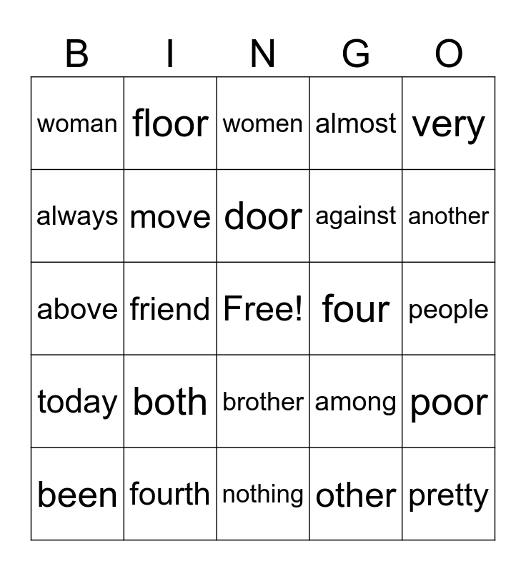 This bingo card has a free space and 29 words: been, into, friend, because, woman, women, move, both, four, fourth, people, pretty, nothing, other, another, mother, brother, today, very, above, among, again, against, always, almost, floor, poor, door and won.