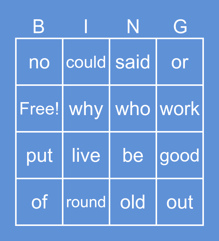 This bingo card has 16 words: round, good, said, no, put, could, be, old, Free!, why, of, or, live, work, who and out.