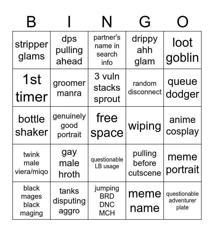 This bingo card has a free space and 24 words: gay male hroth, tanks disputing aggro, 3 vuln stacks sprout, black mages black maging, loot goblin, stripper glams, 1st timer, dps pulling ahead, wiping, questionable LB usage, random disconnect, bottle shaker, pulling before cutscene, meme portrait, groomer manra, meme name, anime cosplay, partner's name in search info, queue dodger, genuinely good portrait, questionable adventurer plate, twink male viera/miqo, drippy ahh glam and jumping BRD DNC MCH.