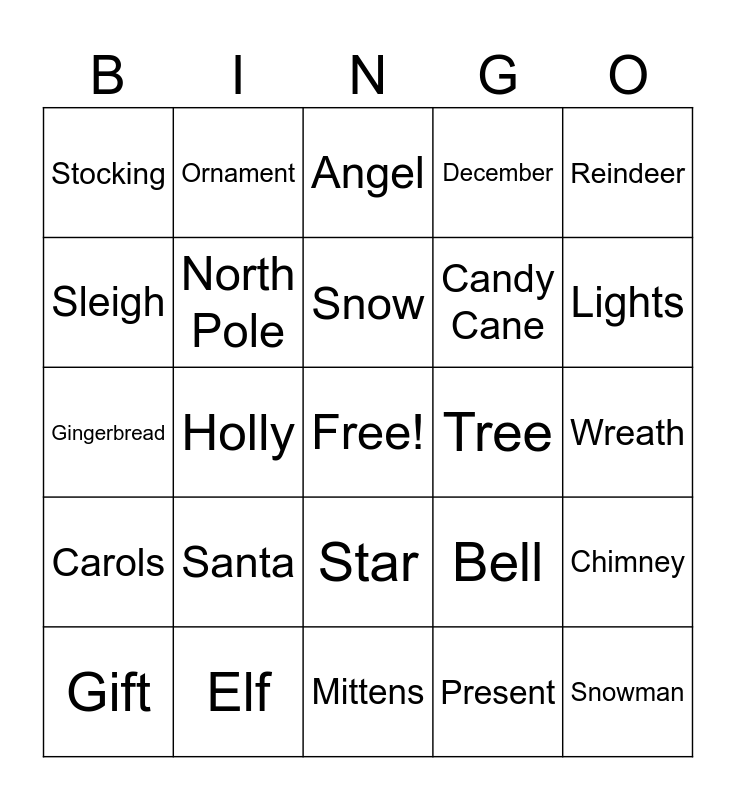 This bingo card has a free space and 24 words: Santa, Elf, Snow, Gift, Reindeer, Stocking, Sleigh, Ornament, Tree, Star, Candy Cane, Gingerbread, Bell, Chimney, North Pole, Present, Wreath, Angel, Lights, Holly, Snowman, Carols, December and Mittens.