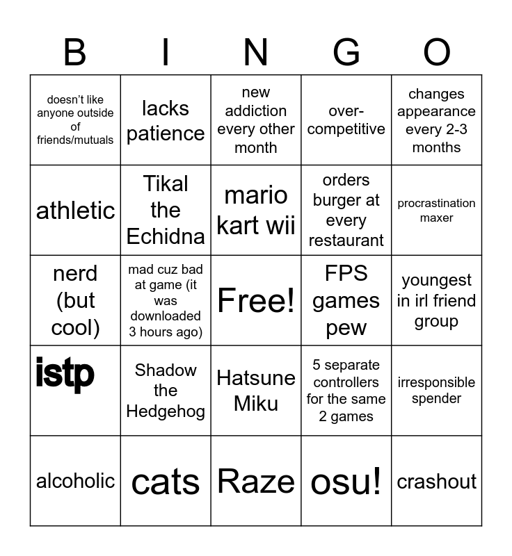 This bingo card has a free space and 24 words: Shadow the Hedgehog, cats, mario kart wii, alcoholic, changes appearance every 2-3 months, doesn’t like anyone outside of friends/mutuals, athletic, lacks patience, FPS games pew, Hatsune Miku, orders burger at every restaurant, nerd (but cool), 5 separate controllers for the same 2 games, irresponsible spender, Tikal the Echidna, osu!, youngest in irl friend group, new addiction every other month, procrastination maxer, mad cuz bad at game (it was downloaded 3 hours ago), crashout, istp, over-competitive and Raze.