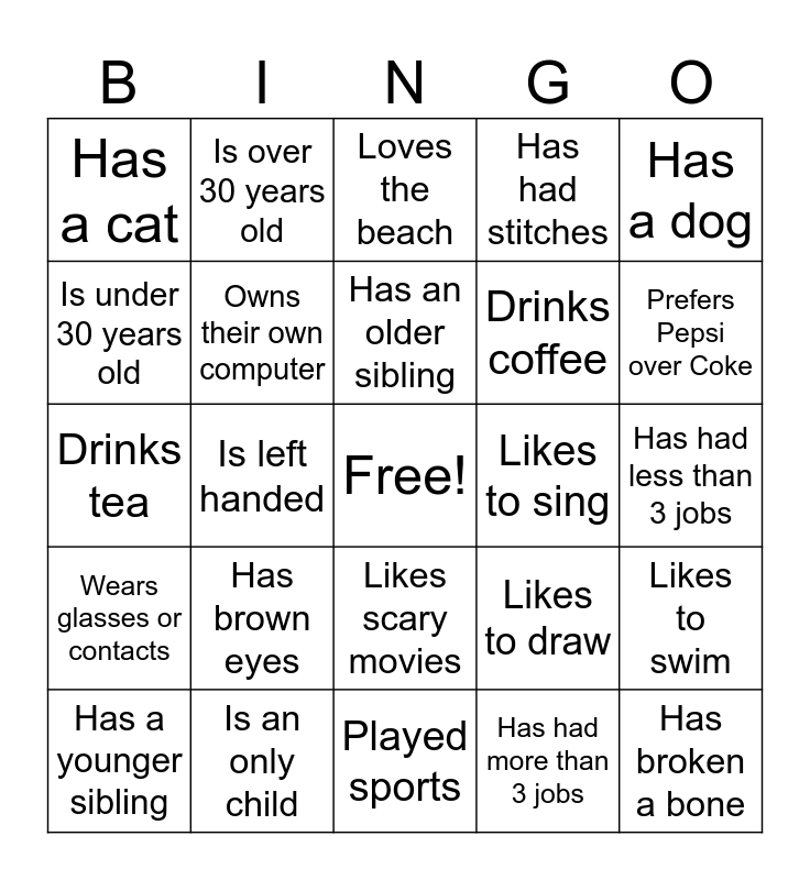 This bingo card has a free space and 24 words: Has brown eyes, Is an only child, Has an older sibling, Has a younger sibling, Has a dog, Has a cat, Is under 30 years old, Is over 30 years old, Likes to sing, Likes scary movies, Drinks coffee, Drinks tea, Likes to draw, Likes to swim, Owns their own computer, Has had more than 3 jobs, Has had less than 3 jobs, Loves the beach, Prefers Pepsi over Coke, Is left handed, Has broken a bone, Wears glasses or contacts, Has had stitches and Played sports.