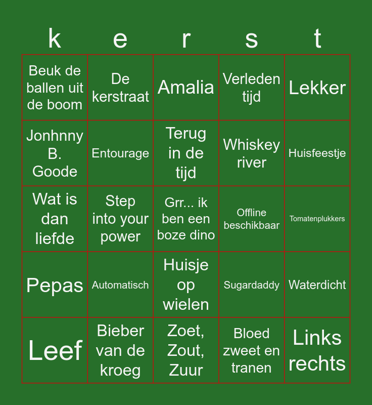 This bingo card has 36 words: Bad memories, Run rudolph run, Santa Tell me, Entourage, Sugardaddy, Pepas, Terug in de tijd, Hier mag alles, Lekker, Drakendans, Step into your power, Verleden tijd, Paracetamollen, Offline beschikbaar, Huisfeestje, Beuk de ballen uit de boom, Links rechts, Automatisch, Grr... ik ben een boze dino, Amalia, Tomatenplukkers, Waterdicht, Bieber van de kroeg, Leef, Zoet, Zout, Zuur, De kerstraat, Wat is dan liefde, De laatste, Whiskey river, Jonhnny B. Goode, All i want for christmas is you, Ladada, Bloed zweet en tranen, Huisje op wielen, Het interesseert mij echt geen ene ... and Engelbewaarder.