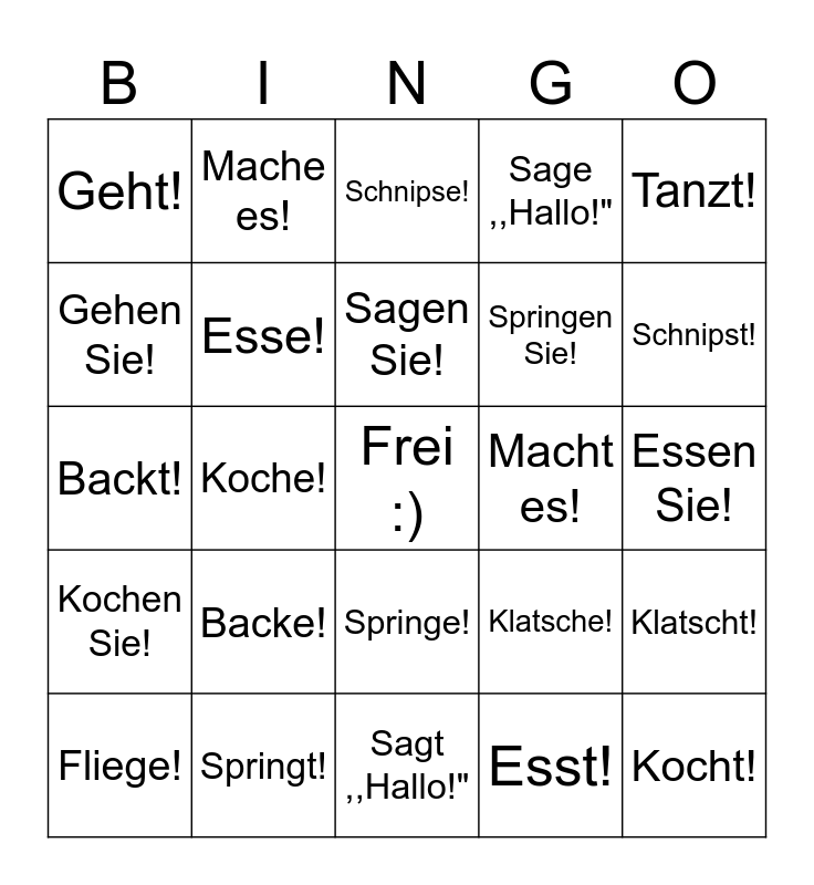 This bingo card has a free space and 24 words: Backe!, Springt!, Sagen Sie!, Fliege!, Tanzt!, Geht!, Gehen Sie!, Mache es!, Macht es!, Springe!, Springen Sie!, Backt!, Klatsche!, Klatscht!, Esse!, Esst!, Essen Sie!, Schnipse!, Schnipst!, Koche!, Kocht!, Kochen Sie!, Sage ,,Hallo!" and Sagt ,,Hallo!".
