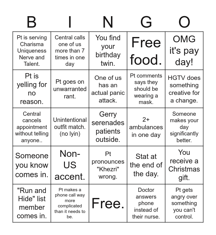 This bingo card has 29 words: "Run and Hide" list member comes in., Pt listens to video/music way too loud., Unintentional outfit match. (no lyin), Pt gets angry over something you can't control., Pt is serving Charisma Uniqueness Nerve and Talent., You find your birthday twin., Pt goes on unwarranted rant., Non-US accent., 2+ ambulances in one day, Pt makes a phone call way more complicated than it needs to be., Someone makes your day significantly better., Gerry serenades patients outside., Free., Doctor answers phone instead of their nurse., HGTV does something creative for a change., Pt makes your uncomfortable., Pt pronounces "Khezri" wrong., Someone you know comes in., OMG it's pay day!, Central cancels appointment without telling anyone.., Stat at the end of the day., One of us snaps. <3, Pt comments says they should be wearing a mask., Pt is yelling for no reason., Free food., Central calls one of us more than 7 times in one day, You receive a Christmas gift., One of us has an actual panic attack. and Pt amount reaches over 450..