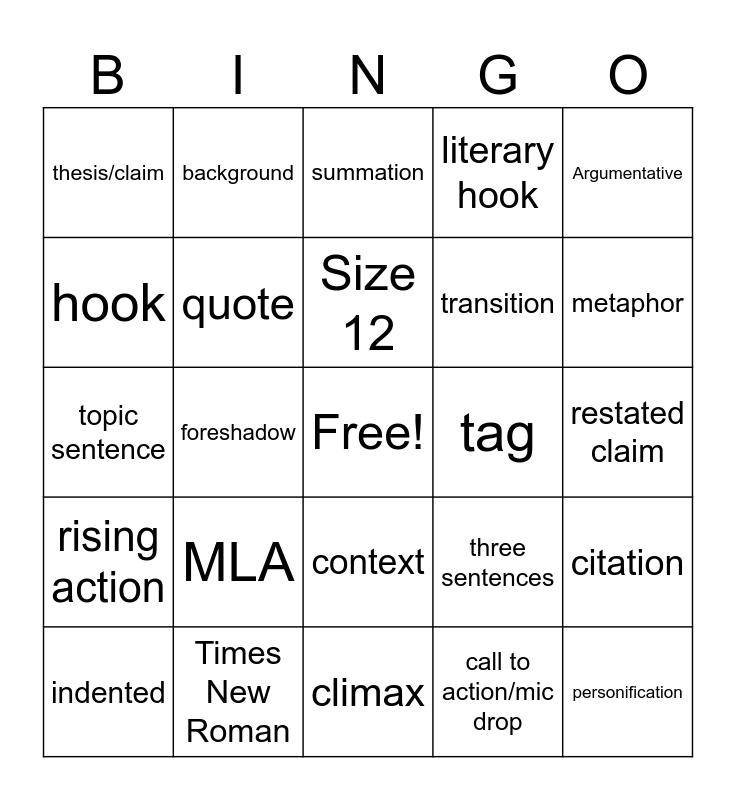 This bingo card has a free space and 24 words: MLA, Times New Roman, Size 12, indented, Argumentative, thesis/claim, hook, background, tag, context, transition, topic sentence, three sentences, citation, quote, call to action/mic drop, restated claim, summation, metaphor, foreshadow, personification, rising action, literary hook and climax.
