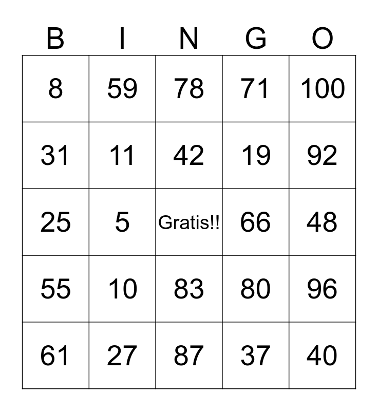 This bingo card has a free space and 24 words: 10, 27, 42, 61, 100, 8, 31, 59, 66, 83, 19, 25, 80, 96, 11, 37, 48, 78, 92, 5, 40, 55, 71 and 87.
