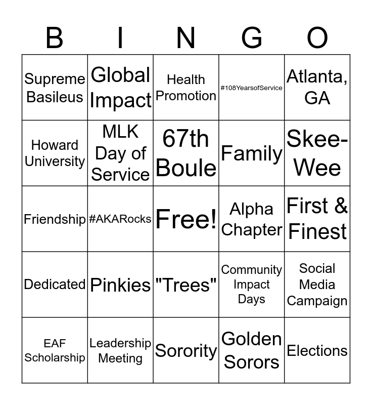 This bingo card has a free space and 24 words: Pinkies, Leadership Meeting, 67th Boule, EAF Scholarship, Atlanta, GA, Supreme Basileus, Howard University, Global Impact, Alpha Chapter, "Trees", Family, Friendship, Community Impact Days, Social Media Campaign, MLK Day of Service, Golden Sorors, First & Finest, Health Promotion, Skee-Wee, #AKARocks, Elections, Dedicated, #108YearsofService and Sorority.