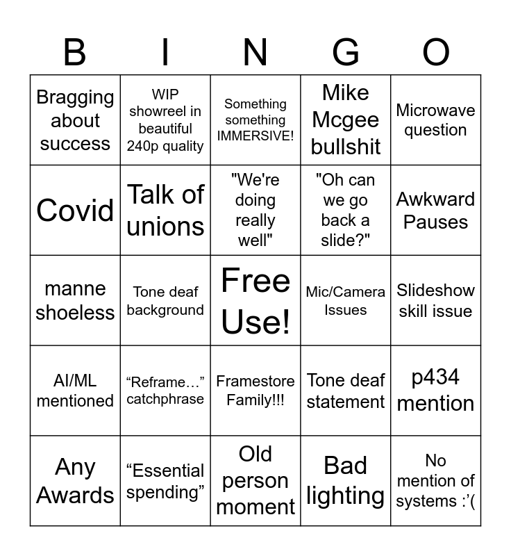 This bingo card has a free space and 39 words: Taxes/Rebates, Borderline tax evasion, Ironic statement, Talk of unions, Any Awards, Framestore Family!!!, "We're doing really well", Skipped QnA question, Microwave question, AI/ML mentioned, Tone deaf background, Mike Mcgee bullshit, No mention of systems :’(, Slideshow skill issue, Mic/Camera Issues, “Reframe…” catchphrase, “Essential Travel”, Bragging about success, Direct quote or compliment from a client praising the work done, Tone deaf statement, Covid, Old person moment, "Oh can we go back a slide?", Awkward Pauses, Awkward conversation, RTO, Project management moment, Ego stroke, “Things are looking up…” followed by bad news, WIP showreel in beautiful 240p quality, Assurances of no more layoffs/office closures, Introduction of new projects, Something something IMMERSIVE!, “Essential spending”, Bad lighting, Really bad yapping, p434 mention, manne shoeless and mention of 4th floor wi-fi.