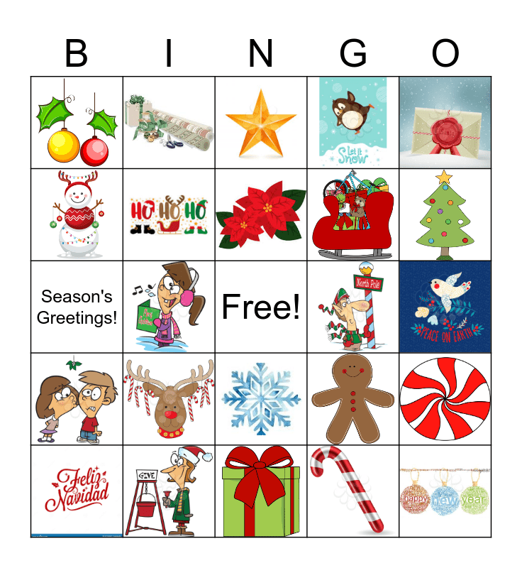 This bingo card has 37 images, a free space and 2 words: Season's Greetings! and Happy Holidays!.