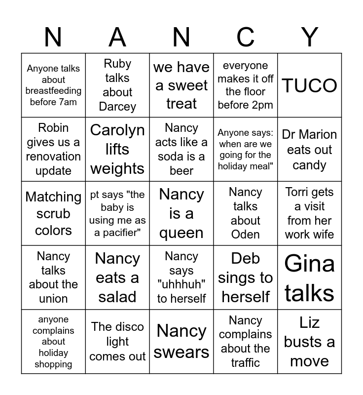 This bingo card has a free space and 24 words: Nancy eats a salad, The disco light comes out, Nancy acts like a soda is a beer, anyone complains about holiday shopping, TUCO, Anyone talks about breastfeeding before 7am, Robin gives us a renovation update, Ruby talks about Darcey, Nancy talks about Oden, Nancy says "uhhhuh" to herself, Anyone says: when are we going for the holiday meal", Matching scrub colors, Deb sings to herself, Gina talks, Carolyn lifts weights, Nancy complains about the traffic, Torri gets a visit from her work wife, we have a sweet treat, Dr Marion eats out candy, pt says "the baby is using me as a pacifier", Liz busts a move, Nancy talks about the union, everyone makes it off the floor before 2pm and Nancy swears.