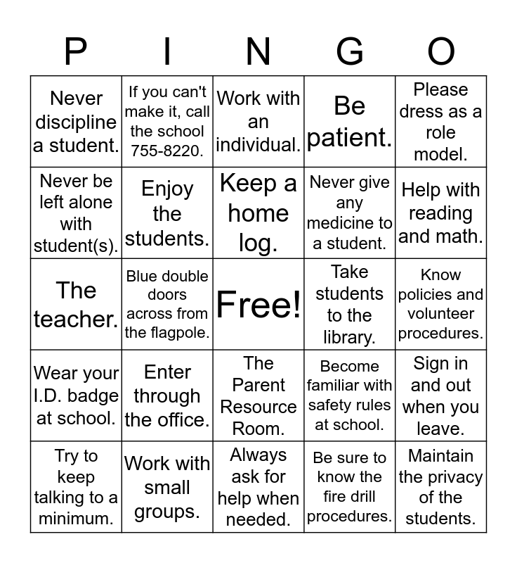 This bingo card has a free space and 24 words: Enter through the office., Work with small groups., Keep a home log., Try to keep talking to a minimum., Please dress as a role model., Never discipline a student., Never be left alone with student(s)., If you can't make it, call the school 755-8220., Take students to the library., The Parent Resource Room., Never give any medicine to a student., The teacher., Become familiar with safety rules at school., Sign in and out when you leave., Enjoy the students., Be sure to know the fire drill procedures., Know policies and volunteer procedures., Work with an individual., Help with reading and math., Blue double doors across from the flagpole., Maintain the privacy of the students., Wear your I.D. badge at school., Be patient. and Always ask for help when needed..