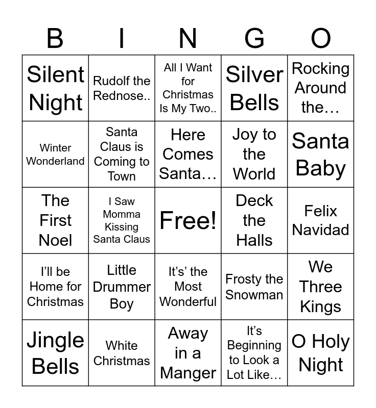 This bingo card has a free space and 24 words: Little Drummer Boy, White Christmas, Here Comes Santa…, Jingle Bells, Rocking Around the…, Silent Night, Winter Wonderland, Rudolf the Rednose.., Deck the Halls, It’s’ the Most Wonderful, Joy to the World, The First Noel, Frosty the Snowman, We Three Kings, Santa Claus is Coming to Town, It’s Beginning to Look a Lot Like…, Felix Navidad, All I Want for Christmas Is My Two.., Santa Baby, I Saw Momma Kissing Santa Claus, O Holy Night, I’ll be Home for Christmas, Silver Bells and Away in a Manger.