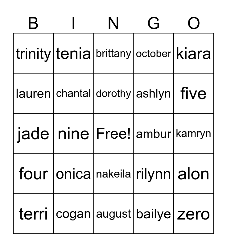 This bingo card has a free space and 24 words: onica, cogan, dorothy, terri, kiara, trinity, lauren, tenia, ambur, nakeila, ashlyn, jade, rilynn, alon, chantal, bailye, kamryn, brittany, five, nine, zero, four, october and august.