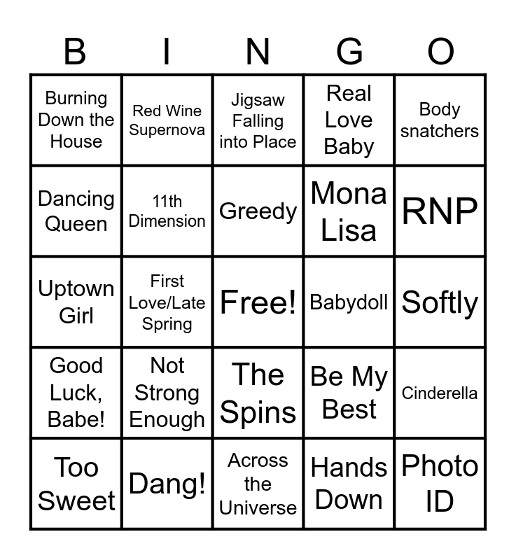 This bingo card has a free space and 30 words: Dang!, Waiting for Black Metal Records to Come in the Mail, First Love/Late Spring, I'm Good Luv, Enjoy, Burning Down the House, Jigsaw Falling into Place, 11th Dimension, The Spins, Babydoll, Across the Universe, Softly, Photo ID, Hands Down, Variations on an Aria, RNP, Blue World, Be My Best, Good Luck, Babe!, Not Strong Enough, Body snatchers, Uptown Girl, Little Bit More, Red Wine Supernova, Mona Lisa, Dancing Queen, Real Love Baby, Cinderella, Too Sweet, Greedy and Cheesin'.