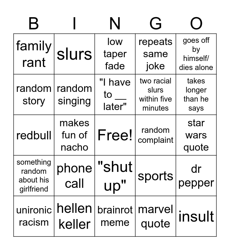 This bingo card has a free space and 27 words: sports, All about the combo, two racial slurs within five minutes, brainrot meme, random story, low taper fade, slurs, something random about his girlfriend, random complaint, dr pepper, redbull, repeats same joke, unironic racism, hellen keller, takes longer than he says, joke about nachos background, random singing, "I have to __ later", phone call, family rant, star wars quote, marvel quote, makes fun of nacho, insult, "shut up", goes off by himself/ dies alone and something abt pets.