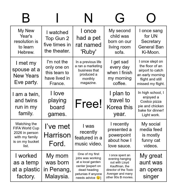 This bingo card has a free space and 24 words: I worked as a temp at a plastic factory., I’ve met Harrison Ford., In a previous life a ran a marketing business that produced a monthly magazine., I once spent an evening hanging out with Lloyd Kauffman, the director of the Toxic Avenger and many other 80s B movies., I once sang for UN Secretary General Ban Ki-Moon., My New Year's resolution is to learn Hebrew., I watched Top Gun 2 five times in the theater., I once had a pet rat named 'Ruby', I plan to travel to Korea this year., In high school, I enjoyed a Costco pizza pie and chicken bake for dinner! Light work., I am a twin, and twins run in my family., I'm not the only one on this team to have lived in France., I recently presented a powerpoint about how I love sauce., My social media feed is mostly funny cat videos., I met my spouse at a New Years Eve party., My mom was born in Penang, Malaysia., One of my first jobs was working at a local garden center [expert on dead heading petunias if anyone needs advice 😉], My second child was born on our living room sofa., I once slept on the floor of an airport to catch an early morning flight and still missed my flight., Watching the FIFA World Cup 2026 in person with my family is on my bucket list., I love playing board games., I was recently featured in a music video., I get sad every day when I finish my morning coffee. and My great aunt was an opera singer.
