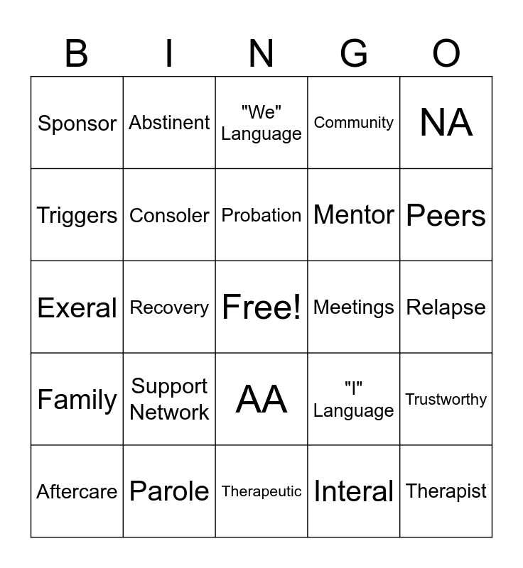 This bingo card has a free space and 24 words: Support Network, Parole, Probation, Aftercare, NA, Sponsor, Triggers, Abstinent, Meetings, AA, Mentor, Exeral, "I" Language, Trustworthy, Consoler, Interal, Relapse, "We" Language, Peers, Recovery, Therapist, Family, Community and Therapeutic.