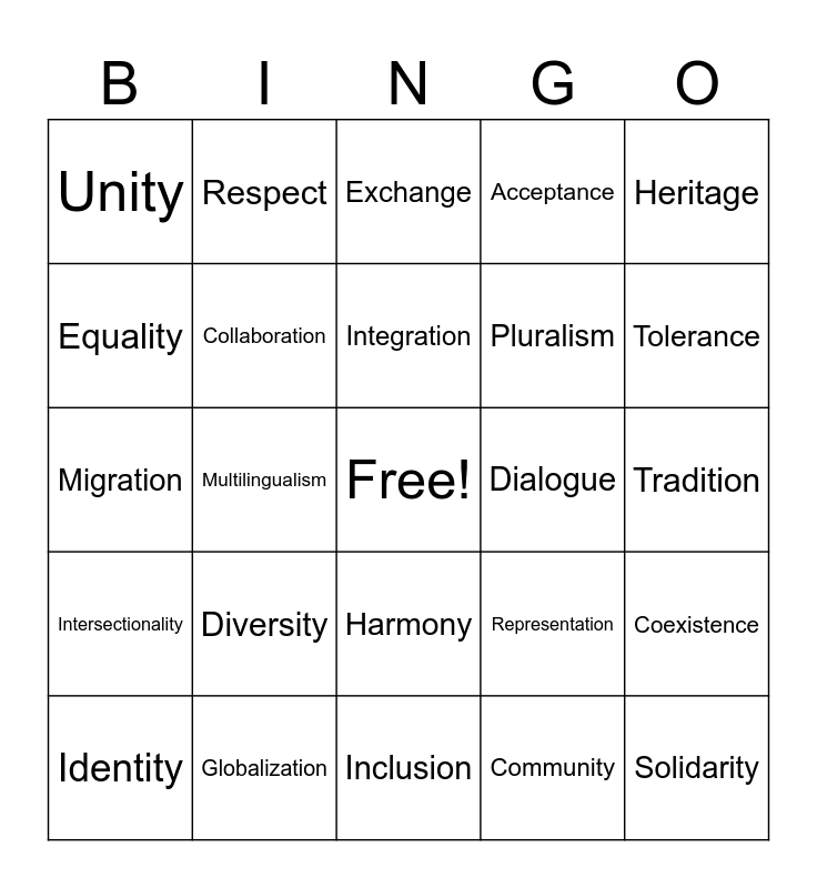 This bingo card has a free space and 25 words: Diversity, Inclusion, Integration, Identity, Heritage, Unity, Equality, Respect, Dialogue, Harmony, Pluralism, Migration, Representation, Coexistence, Collaboration, Understanding, Tradition, Exchange, Tolerance, Multilingualism, Solidarity, Globalization, Intersectionality, Acceptance and Community.