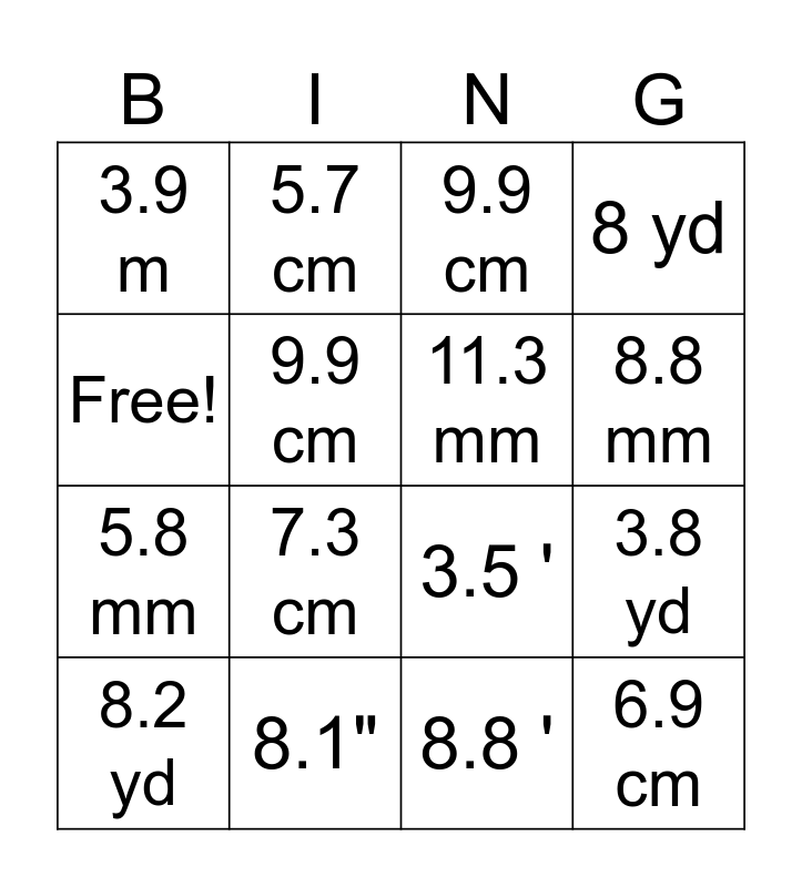 This bingo card has 16 words: 8.1", 3.8 yd, 9.9 cm, 3.9 m, 5.8 mm, 5.7 cm, 3.5 ', 8.8 ', Free!, 9.9 cm, 8.2 yd, 8 yd, 7.3 cm, 8.8 mm, 11.3 mm and 6.9 cm.
