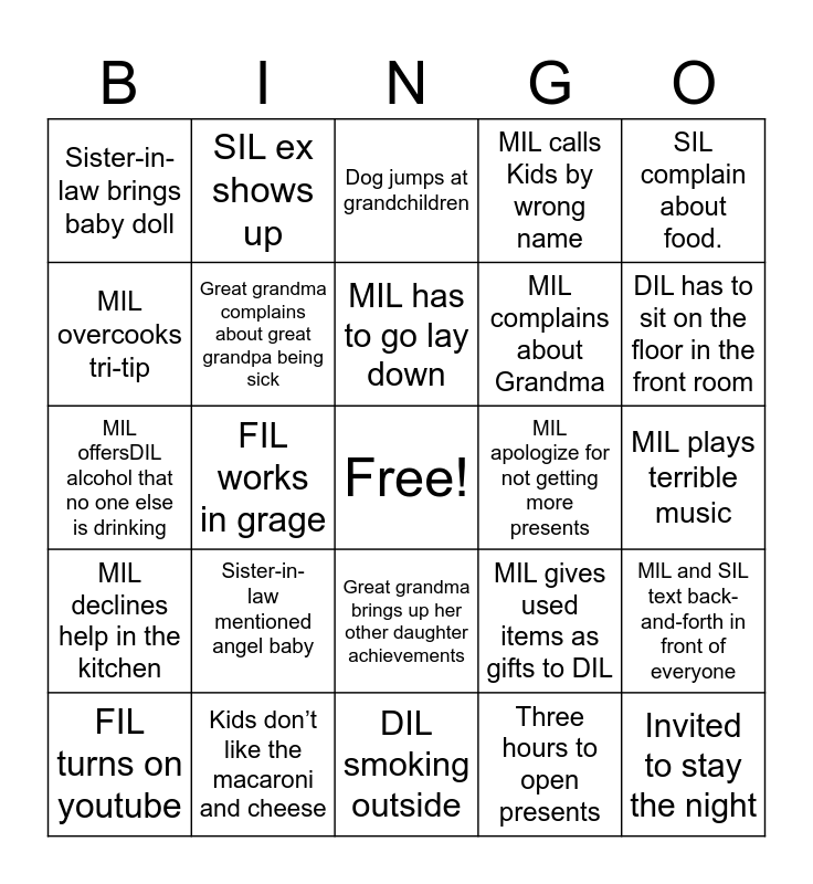 This bingo card has a free space and 24 words: Sister-in-law mentioned angel baby, Kids don’t like the macaroni and cheese, MIL has to go lay down, FIL turns on youtube, SIL complain about food., Sister-in-law brings baby doll, MIL overcooks tri-tip, SIL ex shows up, MIL apologize for not getting more presents, Great grandma brings up her other daughter achievements, MIL complains about Grandma, MIL offersDIL alcohol that no one else is drinking, MIL gives used items as gifts to DIL, MIL and SIL text back-and-forth in front of everyone, Great grandma complains about great grandpa being sick, Three hours to open presents, MIL plays terrible music, Dog jumps at grandchildren, DIL has to sit on the floor in the front room, FIL works in grage, Invited to stay the night, MIL declines help in the kitchen, MIL calls Kids by wrong name and DIL smoking outside.