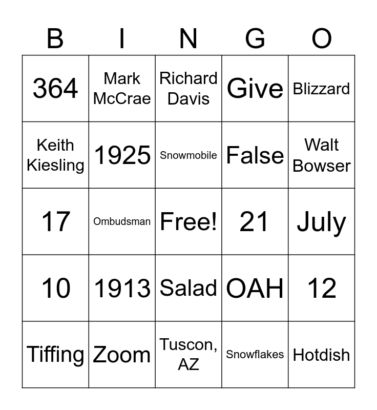 This bingo card has a free space and 27 words: OAH, 6, False, Tuscon, AZ, Keith Kiesling, Richard Davis, Mark McCrae, 10, 21, 12, 17, Give, Tiffing, Zoom, Walt Bowser, 3 Calendar Days, 1925, Snowmobile, 1913, 364, July, Snowflakes, Ombudsman, Hotdish, Salad, Blizzard and Coca Cola.