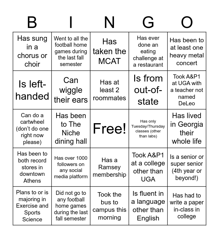 This bingo card has a free space and 40 words: Beat at least one video game in the past 6 months, Can do a cartwheel (don’t do one right now please), Can play a musical instrument, Can wiggle their ears, Did not go to any football home games during the last fall semester, Has a Ramsey membership, Has at least 2 roommates, Has been to at least one event at Stegeman Coliseum, Has been to at least one heavy metal concert, Has been to both record stores in downtown Athens, Has been to The Niche dining hall, Has ever done an eating challenge at a restaurant, Has had to write a paper in-class in college, Has lived in Georgia their whole life, Has only Tuesday/Thursday classes (other than labs), Has over 1000 followers on any social media platform, Has read at least one book recreationally in the past 6 months, Has sung in a chorus or choir, Has taken a ballroom dancing class, Has taken the MCAT, Is a senior or super senior (4th year or beyond!), Is fluent in a language other than English, Is from out-of-state, Is left-handed, Is on any of the UGA meal plans, Is wearing a hat right now, Lived in Brumby their freshman year, Lived in Creswell their freshman year, Lived in Russell their freshman year, Not planning to go into a healthcare profession, Pays for a music subscription service other than Spotify, Plans to or is majoring in Exercise and Sports Science, Stayed in Athens during the most recent spring break or Thanksgiving break, Took A&P1 at a college other than UGA, Took A&P1 at UGA with a teacher not named DeLeo, Took the bus to campus this morning, Uses a non-Mac laptop, Wants to go into dentistry (including dental assistant or hygienist), Went to all the football home games during the last fall semester and Worked at a summer camp during the most recent summer break.