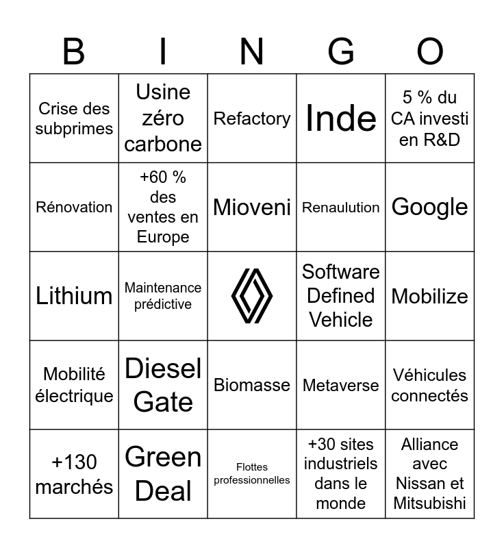 This bingo card has a free space and 24 words: Diesel Gate, Green Deal, Mioveni, +130 marchés, 5 % du CA investi en R&D, Crise des subprimes, Rénovation, Usine zéro carbone, Software Defined Vehicle, Biomasse, Renaulution, Lithium, Metaverse, Véhicules connectés, +60 % des ventes en Europe, +30 sites industriels dans le monde, Mobilize, Refactory, Google, Maintenance prédictive, Alliance avec Nissan et Mitsubishi, Mobilité électrique, Inde and Flottes professionnelles.