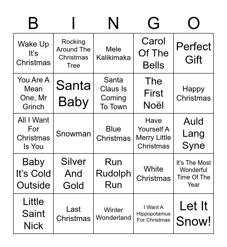 This bingo card has 40 words: Jingle Bell Rock, All I Want For Christmas Is You, It’s Beginning To Look A Lot Like Christmas, Santa Baby, Last Christmas, Run Rudolph Run, Santa Claus Is Coming To Town, Deck The Hall, Perfect Gift, Baby It’s Cold Outside, Snowman, Carol Of The Bells, Blue Christmas, Auld Lang Syne, Have Yourself A Merry Little Christmas, Silver And Gold, Twelve Days of Christmas, Wake Up It’s Christmas, I’ll Be Home For Christmas, Mele Kalikimaka, It’s The Most Wonderful Time Of The Year, I Want A Hippopotamus For Christmas, The First Noël, You Are A Mean One, Mr Grinch, Santa Tell Me, Sleigh Ride, Santa, Can’t You Hear Me, Frosty The Snowman, Let It Snow!, You Make It Feel Like Christmas, O Holy Night, Little Saint Nick, Mistletoe, White Christmas, Happy Christmas, Winter Wonderland, Santa, Tell Me, Holly Jolly Christmas, Rocking Around The Christmas Tree and Silent night.