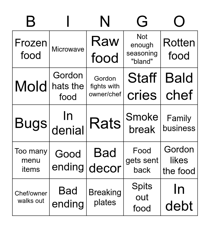 This bingo card has a free space and 24 words: Good ending, Bad ending, Gordon fights with owner/chef, Chef/owner walks out, Rotten food, Frozen food, Mold, Microwave, Smoke break, Bad decor, Staff cries, Bugs, Food gets sent back, Gordon likes the food, Gordon hats the food, Spits out food, Family business, Raw food, Bald chef, In denial, In debt, Too many menu items, Not enough seasoning "bland" and Breaking plates.