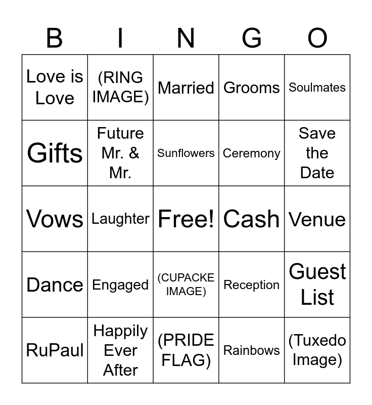 This bingo card has a free space and 24 words: RuPaul, Engaged, Sunflowers, Rainbows, Soulmates, Love is Love, (RING IMAGE), Married, Cash, Venue, Vows, Future Mr. & Mr., Reception, Guest List, Gifts, Happily Ever After, (PRIDE FLAG), Grooms, Save the Date, Dance, Laughter, (CUPACKE IMAGE), Ceremony and (Tuxedo Image).