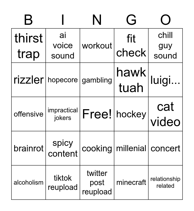 This bingo card has a free space and 24 words: spicy content, tiktok reupload, gambling, alcoholism, chill guy sound, thirst trap, rizzler, ai voice sound, hockey, cooking, hawk tuah, offensive, millenial, concert, hopecore, minecraft, cat video, workout, luigi..., impractical jokers, relationship related, brainrot, fit check and twitter post reupload.