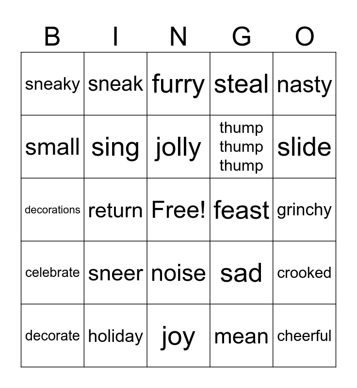 This bingo card has a free space and 24 words: sneer, holiday, jolly, decorate, nasty, sneaky, small, sneak, feast, noise, thump thump thump, decorations, sad, crooked, sing, mean, grinchy, furry, slide, return, cheerful, celebrate, steal and joy.