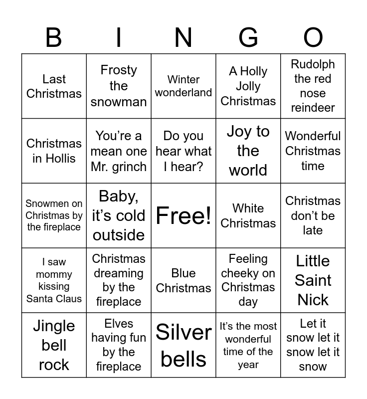 This bingo card has a free space and 44 words: Rockin around the Christmas tree, Let it snow let it snow let it snow, It’s beginning to look a lot like Christmas, Jingle bell rock, Jingle bells, It’s the most wonderful time of the year, Winter wonderland, Sleigh ride, Rudolph the red nose reindeer, Elves having fun by the fireplace, A Holly Jolly Christmas, White Christmas, Blue Christmas, Christmas dreaming by the fireplace, Run Rudolph run, Silver bells, Have yourself a Merry Little Christmas, Snowmen on Christmas by the fireplace, Santa Claus is coming to town, Wonderful Christmas time, Frosty the snowman, Jolly Christmas and fun by the fireplace, Christmas time is here, Last Christmas, Santa is having so much fun on Christmas, Christmas don’t be late, Please come home for Christmas, Carol of the bells, Feeling cheeky on Christmas day, I saw mommy kissing Santa Claus, What Christmas means to me, Little Saint Nick, Deck the hall, Do they know it’s Christmas, Baby, it’s cold outside, Feliz Navidad, Silent night, All I want for Christmas is you, Do you hear what I hear?, Christmas in Hollis, Joy to the world, Santa tell me, You’re a mean one Mr. grinch and I’ll be home for Christmas.