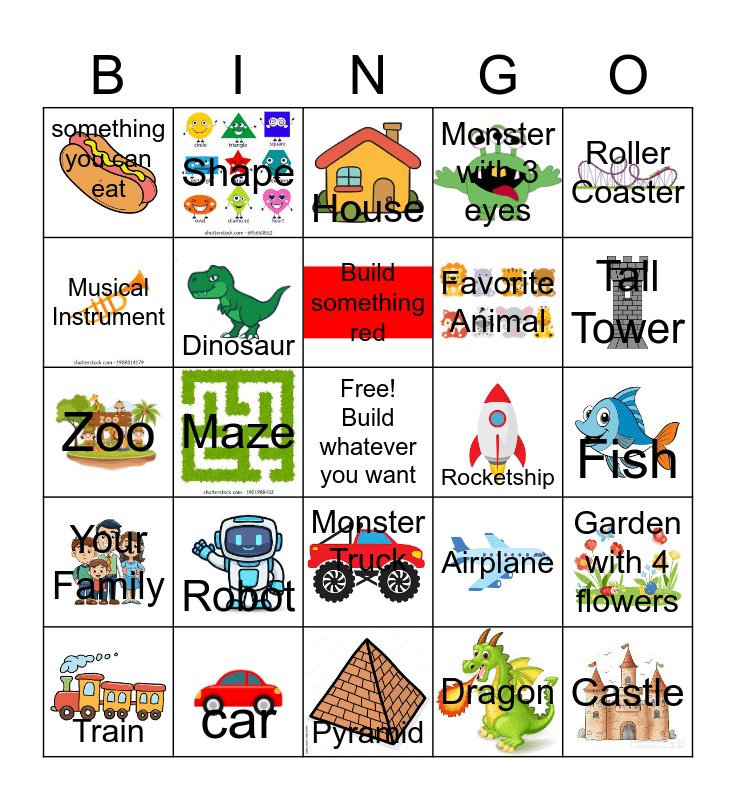 This bingo card has 29 images, a free space and 29 words: Train, School, Maze, Something you wear, something you can eat, House, Dinosaur, Robot, Rocketship, car, Fish, Castle, Pyramid, Dragon, Tall Tower, Horse, Monster Truck, Your Family, Roller Coaster, Zoo, Airplane, Pirate Ship, Favorite Animal, Musical Instrument, Monster with 3 eyes, Shape, Garden with 4 flowers, Build something red and Tool.