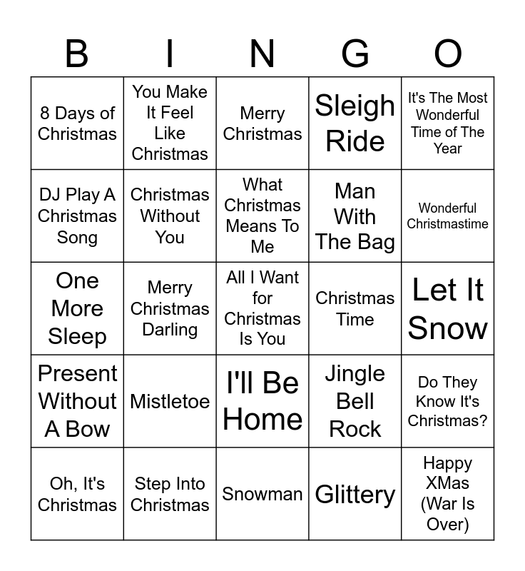 This bingo card has 50 words: Santa Tell Me, All I Want for Christmas Is You, Last Christmas, Snowman, Mistletoe, Like It's Christmas, You Make It Feel Like Christmas, Merry Christmas, Happy Holidays, DJ Play A Christmas Song, My Only Wish (This Year), Christmas Without You, Sleigh Ride, Do They Know It's Christmas?, Jingle Bell Rock, Shake Up Christmas, Christmas Wrapping, What Christmas Means To Me, Christmas Time, This Christmas, It's The Most Wonderful Time of The Year, Merry Christmas Darling, Glittery, 8 Days of Christmas, Man With The Bag, Santa Claus Is Comin' to Town, Happy XMas (War Is Over), Wonderful Christmastime, Underneath the Tree, Merry Christmas, I'll Be Home, A Nonsense Christmas, Christmas Tree Farm, Have Yourself a Merry Little Christmas, Dear Santa, Step Into Christmas, River, Christmas Eve, Fa La La, Angels We Have Heard On High, Let It Snow, The Christmas Song (Chestnuts Roasting on an Open Fire), I Saw Mommy Kissing Santa Claus, Little Saint Nick, Candy Cane Lane, Oh, It's Christmas, One More Sleep, You're A Mean One, Mr. Grinch, Jingle Bell Rock- Daryl's Version, Present Without A Bow and santa doesn't know you like I do.