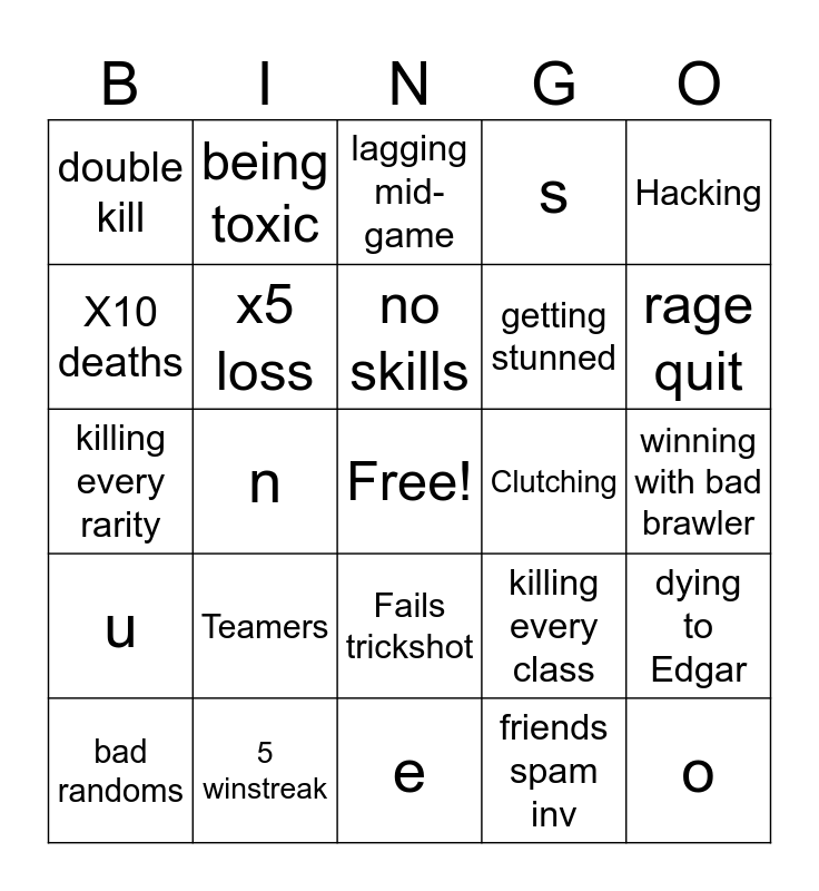 This bingo card has a free space and 24 words: Teamers, 5 winstreak, no skills, bad randoms, Hacking, double kill, X10 deaths, being toxic, Clutching, Fails trickshot, getting stunned, killing every rarity, killing every class, dying to Edgar, x5 loss, friends spam inv, winning with bad brawler, lagging mid-game, rage quit, n, o, u, s and e.