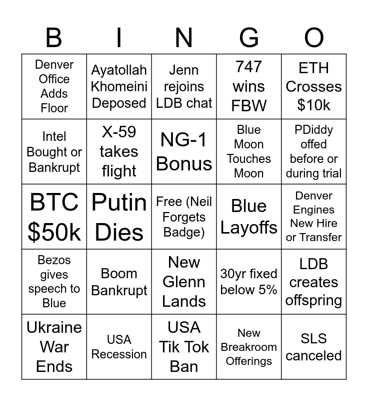 This bingo card has a free space and 24 words: Boom Bankrupt, USA Recession, NG-1 Bonus, Ukraine War Ends, ETH Crosses $10k, Denver Office Adds Floor, Intel Bought or Bankrupt, Ayatollah Khomeini Deposed, Blue Layoffs, New Glenn Lands, Blue Moon Touches Moon, BTC $50k, 30yr fixed below 5%, LDB creates offspring, X-59 takes flight, New Breakroom Offerings, Denver Engines New Hire or Transfer, Jenn rejoins LDB chat, PDiddy offed before or during trial, Putin Dies, SLS canceled, Bezos gives speech to Blue, 747 wins FBW and USA Tik Tok Ban.