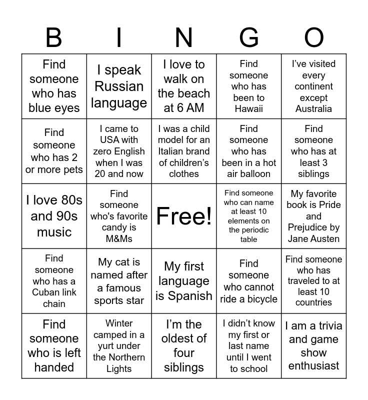 This bingo card has a free space and 90 words: I performed on ESPN and won $10K, My work won an award at Disney Epcot Center, My first language is Spanish, I solo-traveled to France and Germany, I’m from the Dominican Republic, I was captain of the volleyball team in high school, I have a selfie with a lion, My favorite color is red, I’m the designated gift wrapper in my house, I play the guitar, Each of my children was born in a different country/state, I am a veteran, I was born and raised in Cuba, My favorite book is Pride and Prejudice by Jane Austen, I used to dance flamenco, I was a child model for an Italian brand of children’s clothes, I was cast as Snow White in a children’s TV show, My cat is named after a city in Florida, I have a cat named Abby, I have three sons, I grew up in New York, I love salsa, I’m the oldest of four siblings, I’m an FIU grad. Go Panthers, I love 80s and 90s music, Winter camped in a yurt under the Northern Lights, Studied Flamenco, Worked as local road-crew for Pink Floyd, I can drive an 18-wheeler, I regularly drove a stick shift 1953 Chevrolet on the road at age 11, I know two phrases in Mandarin, Find someone who has traveled to at least 10 countries, Find someone who has gone on a safari, Find someone who has a Cuban link chain, Find someone who has blue eyes, Find someone who has been to Hawaii, I love to walk on the beach at 6 AM, Find someone who is an only child, Find someone who's favorite candy is M&Ms, Find someone who has at least 3 siblings, Find someone who is left handed, Find someone who has 2 or more pets, Find someone who has gone to a theme park, Find someone with the same birth month as you, Find someone who is a notary public, Find someone who cannot ride a bicycle, Find someone who owns the same brand of car as you, Find someone who has never flown on an airplane, Find someone who collects something, Find someone who has fostered or adopted a child, Find someone who has been in a helicopter, Find someone who has been in a hot air balloon, Find someone who has moved in the last year, Find someone who recently got married, Find someone who reads physical news papers, Find someone who had a long distance relationship, Find someone who can name at least 10 elements on the periodic table, Find someone who taught a class, Find someone who belongs to a club, Find someone who listens to podcasts, I lived in Thailand, I speak four languages from four different continents, I lived in South Africa when Apartheid ended, I am learning Portuguese, I was a museum docent in an actual museum when I was in 4th grade, I was a certified American Red Cross lifeguard and water safety instructor, I love to travel, I didn’t know my first or last name until I went to school, I’ve had gray hair since I was a kid, My father was born with white hair, My cat is named after a famous sports star, I am a trivia and game show enthusiast, I listen to true crime podcasts, My favorite food is tacos, I speak Russian language, I came to USA with zero English when I was 20 and now, I have 2 master’s degree from FIU, I know how to play accordion, I make pottery in my free time, I write poetry, I write fiction as a hobby, I’ve visited every continent except Australia, Find someone who has visited at least 10 US states, Find someone who has more than 1 tattoo, Find someone who has read a book in the past week, Find someone who has gone to a music festival, I'm a certified scuba diver, I'm a DJ, Find someone who has performed on stage and Find someone who has gone on a cruise.