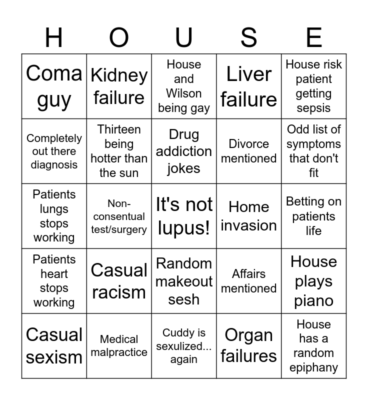 This bingo card has a free space and 29 words: Casual sexism, Vicodin being taken like its candy, Non-consentual test/surgery, Weird metaphor that makes little to no sense, Coma guy, House and Wilson being gay, Thirteen being hotter than the sun, Casual racism, Home invasion, Medical malpractice, Betting on patients life, House has a random epiphany, Cuddy is sexulized... again, Organ failures, Odd list of symptoms that don't fit, Clinic duty sucks..., Random makeout sesh, Patients heart stops working, House risk patient getting sepsis, Patients lungs stops working, Affairs mentioned, Patient nearly dies before they are healed, Divorce mentioned, Completely out there diagnosis, Liver failure, Kidney failure, House plays piano, Drug addiction jokes and Wilson is forced to pay for Houses lunch.