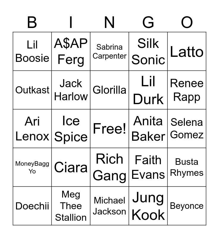 This bingo card has a free space and 24 words: Ciara, Meg Thee Stallion, Glorilla, Doechii, Latto, Lil Boosie, Outkast, A$AP Ferg, Anita Baker, Rich Gang, Lil Durk, Ari Lenox, Faith Evans, Busta Rhymes, Jack Harlow, Jung Kook, Selena Gomez, Sabrina Carpenter, Renee Rapp, Ice Spice, Beyonce, MoneyBagg Yo, Silk Sonic and Michael Jackson.