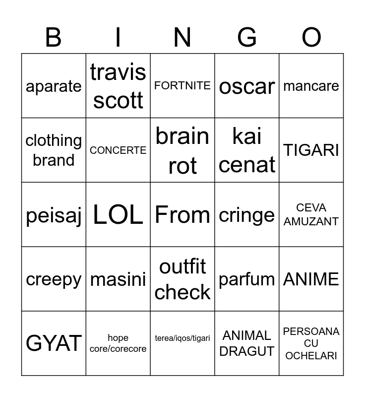 This bingo card has a free space and 24 words: masini, hope core/corecore, brain rot, GYAT, mancare, aparate, clothing brand, travis scott, cringe, outfit check, kai cenat, peisaj, parfum, ANIME, CONCERTE, ANIMAL DRAGUT, CEVA AMUZANT, FORTNITE, TIGARI, LOL, PERSOANA CU OCHELARI, creepy, oscar and terea/iqos/tigari.